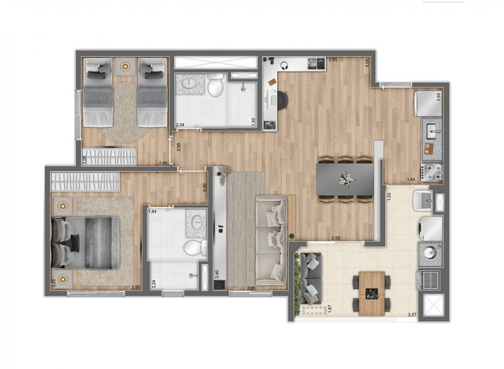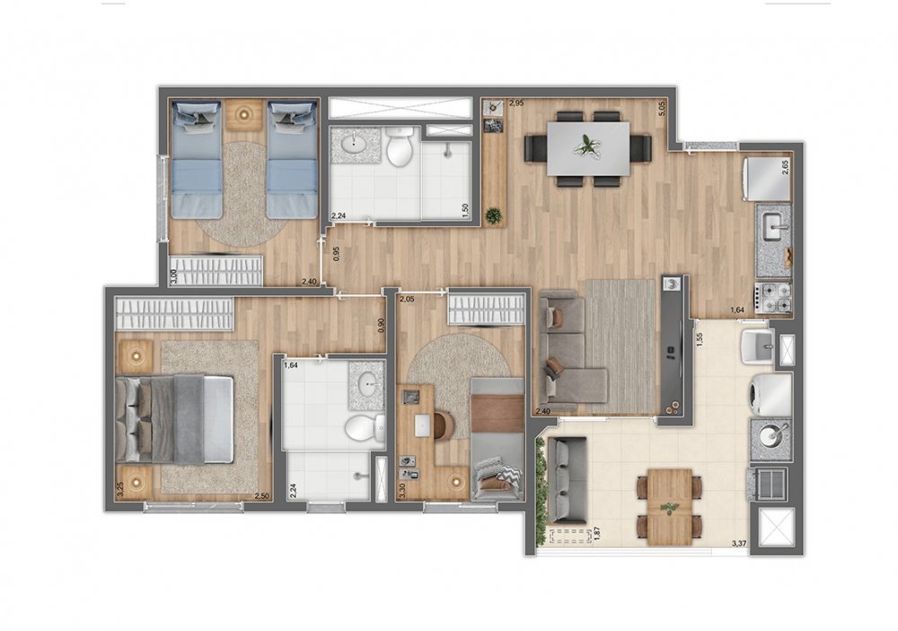 70m² - 3 dormitórios com suíte e varanda
