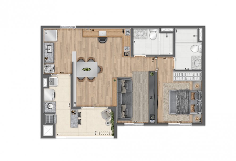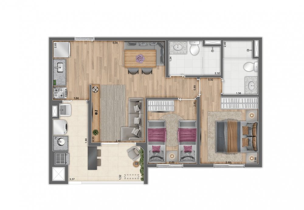 56m² - 2 dormitórios com suíte e varanda